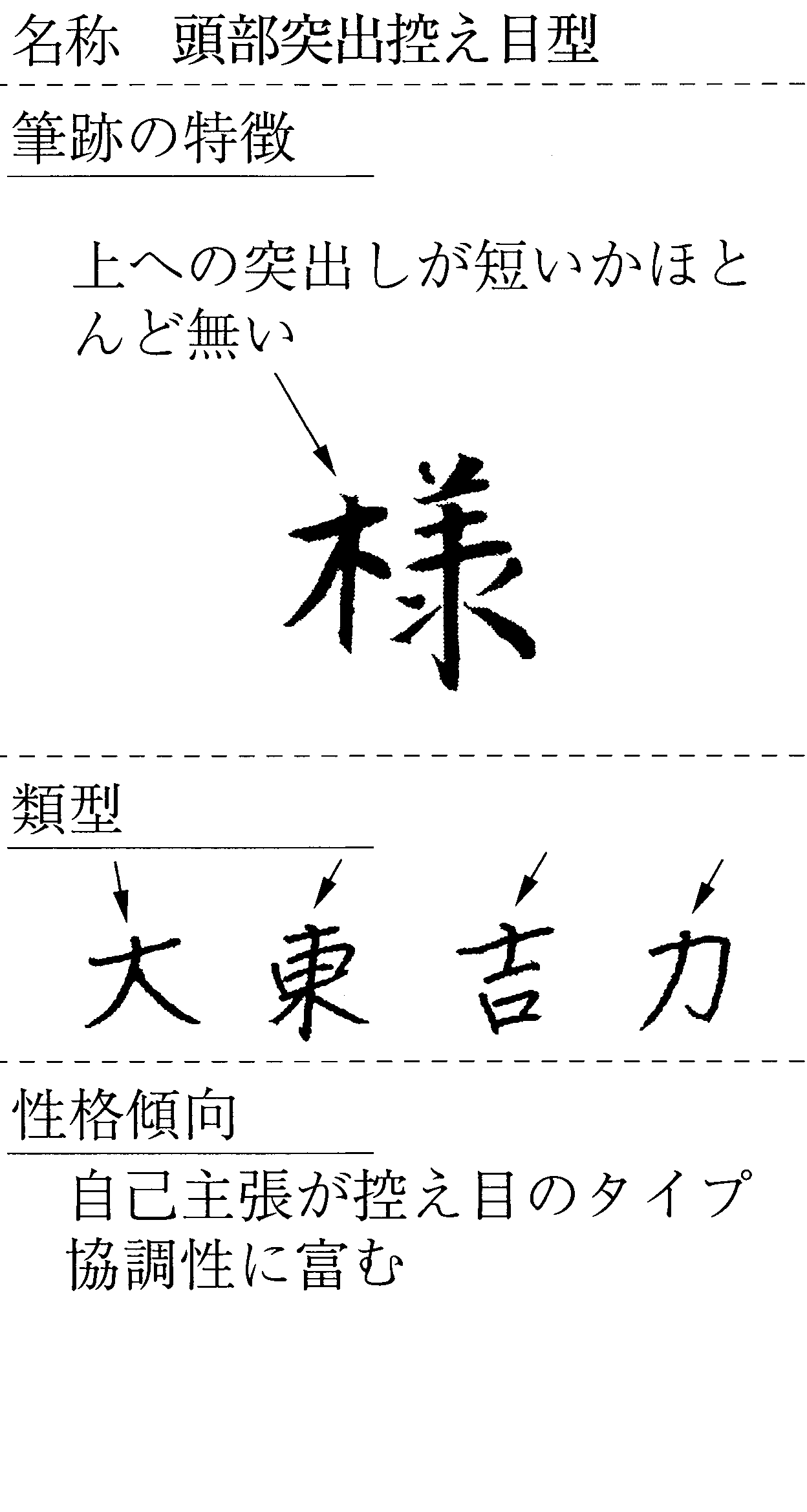 すでにある横線に対して、1本の縦線をその上のどの位置から書き始めるかによって突出度が決まります。突出度が低いか、全く突出していない場合、頭部突出控え目型にあたります。「様」の場合、木へんの縦線で判断できます。