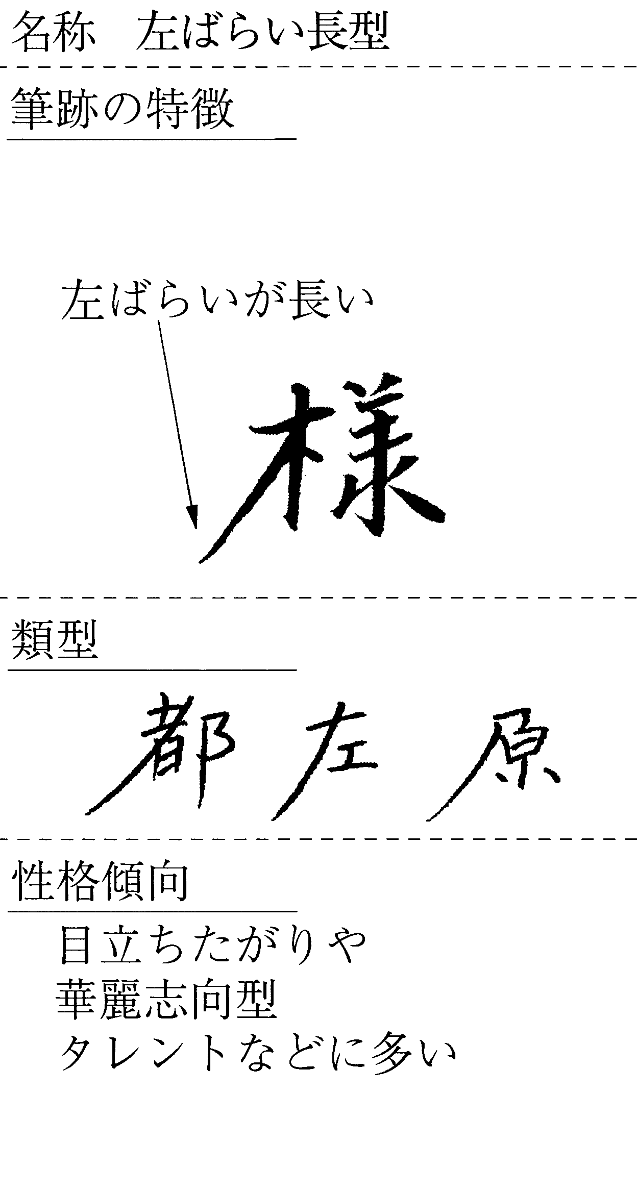 右のはらいは字の最終画にあることが多いですが、左はそうでないことがほとんどです。はらいを長くするほど次の画に移動する距離が長くなってしまい、書字の効率は悪くなってしまいます。にもかかわらず左ばらいを長くする人には、目立ちたい華やかな心があると考えられます。勢いよくはらって長くすれば、それだけで華やかな文字になります。しかし、ただ長ければいいというものでもありません。どれくらい長いと美しいのか。それを無意識のうちに計算する「美意識」を持っている人物で、スター性があるといえます。