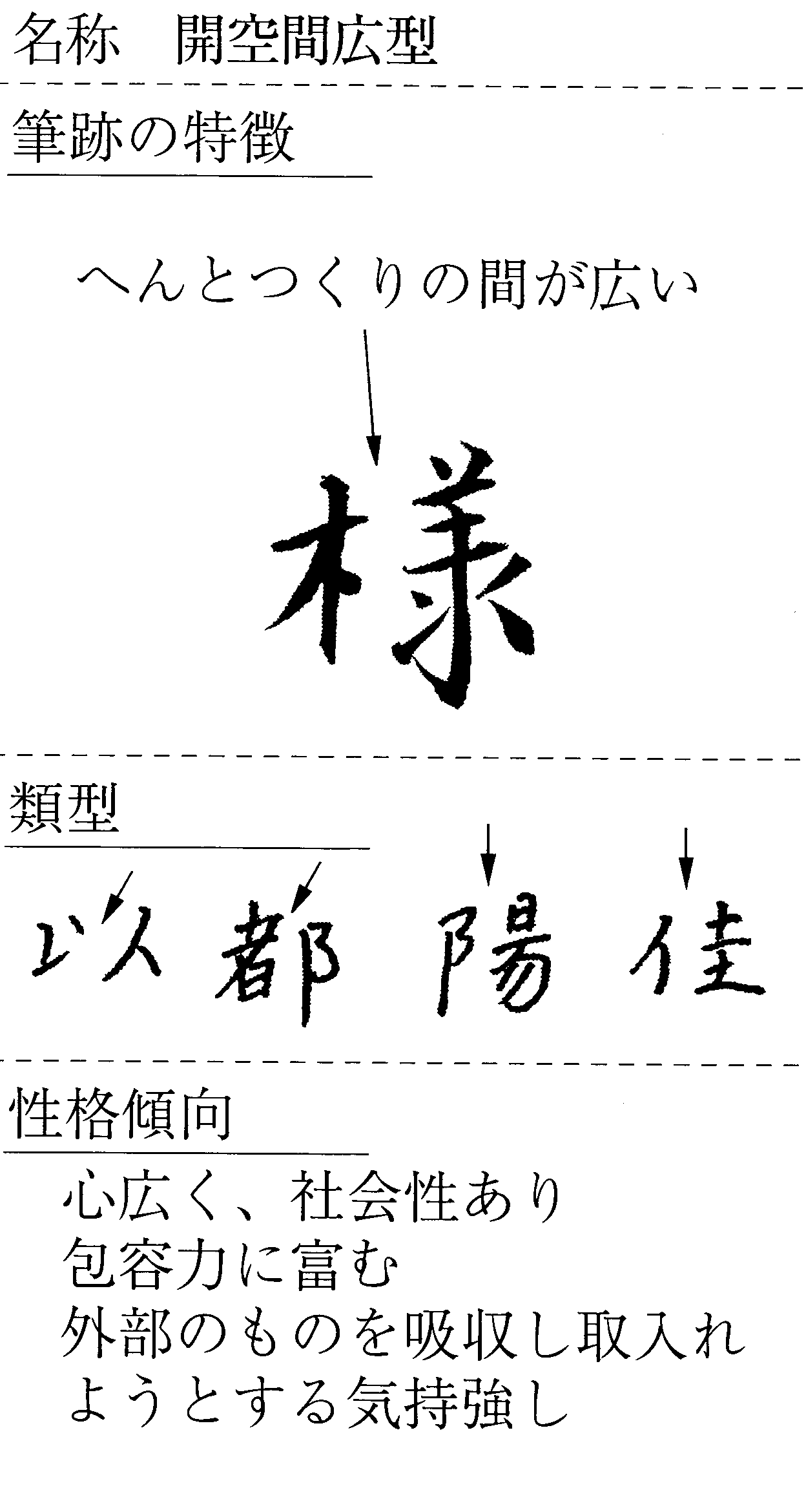 へんとつくりが存在する文字などで、その間にできた上下などが開けた空間のことを「開空間」とよびます。開空間が広い、つまり普通へんとつくりの間隔が離れている場合、開空間広型にあたります。