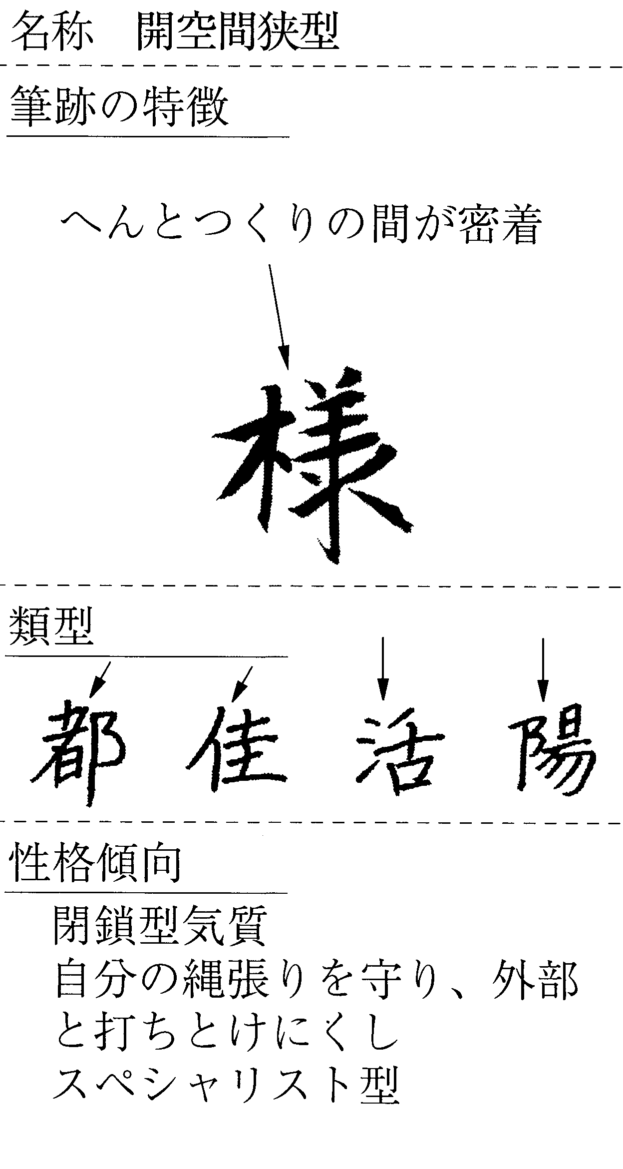 へんとつくりが存在する文字などで、その間にできた上下などが開けた空間のことを「開空間」とよびます。開空間が狭い、つまり普通へんとつくりの間隔が狭いかほとんど密着している場合、開空間狭型にあたります。
