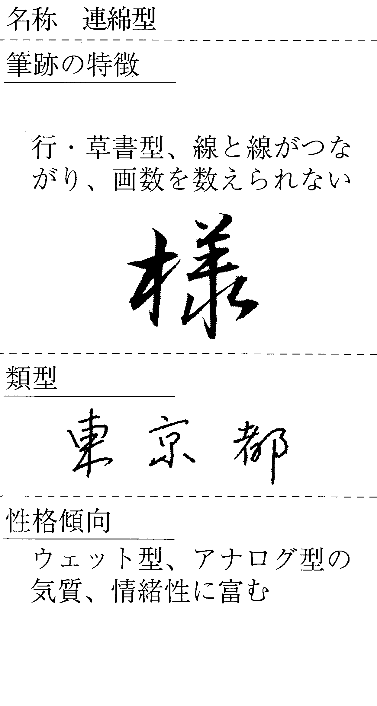 小学校教育では、書き方の指導は一貫して楷書、つまり連綿のないもので、連綿のある行書が教育に出てくるのは中学校以降の書道教育においてのみです。にも関わらず書き方が連綿になる理由は、連綿になった他の人の文字を見ているからです。連綿の書き方を好む人は、感化されやすい人。つまり、感受性が高く情に厚い人であると考えることができます。