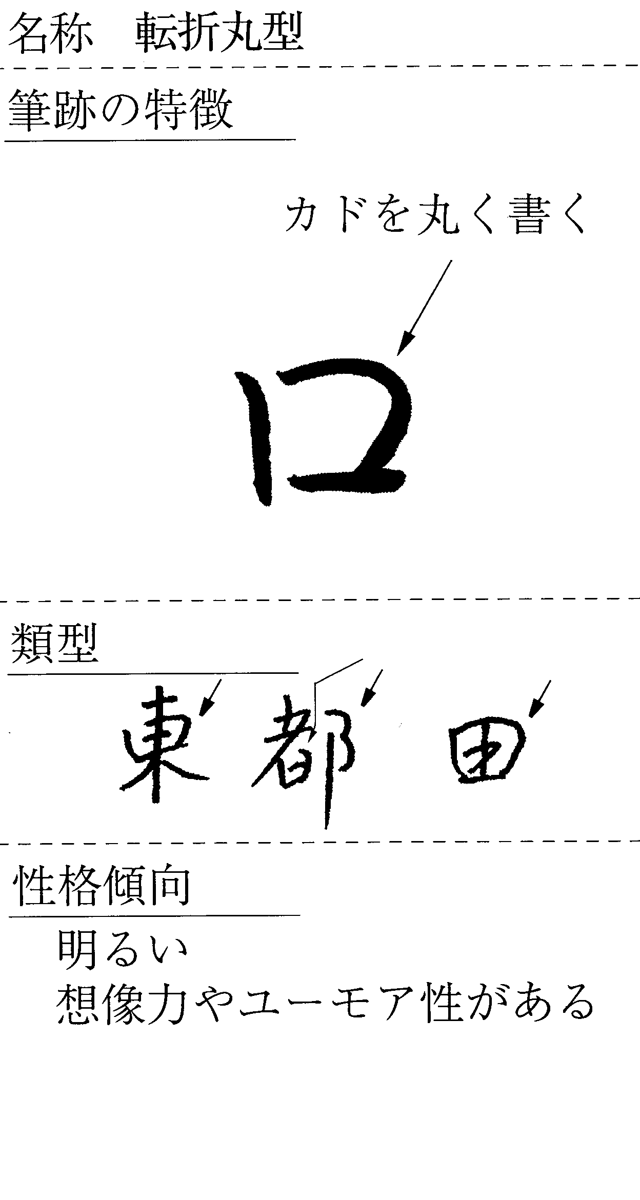 「口」の2画目のように、線を書きながら折れ曲がる部分のことを「転折部」といいます。転折部が丸まっている場合、転折丸型になります。